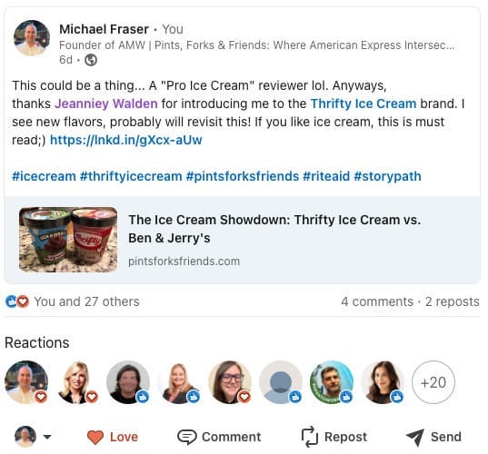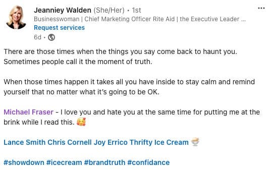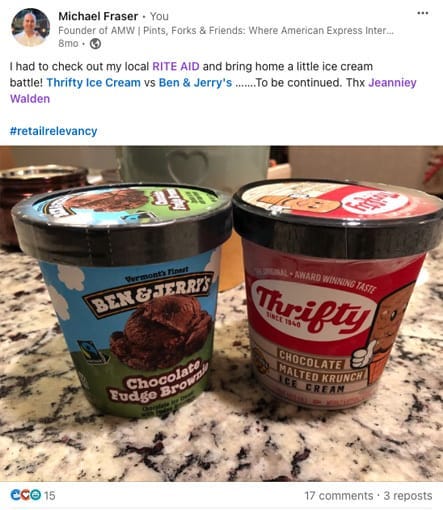 Alright, back to LinkedIn. I started with a post sharing my plan to do a taste test between Thrifty Ice Cream and the popular Ben & Jerry’s. I mentioned that I had gone to my local Rite Aid and brought home a little ice cream showdown. I also tagged Rite Aid’s CMO, Jeanniey Walden. Now, tagging a CMO doesn’t always guarantee a response, but since I’m connected to Jeanniey, I know she runs her social media the way a C-suite executive should—very active, always listening, and authentically engaged. So I felt confident that this post had good odds of gaining traction.