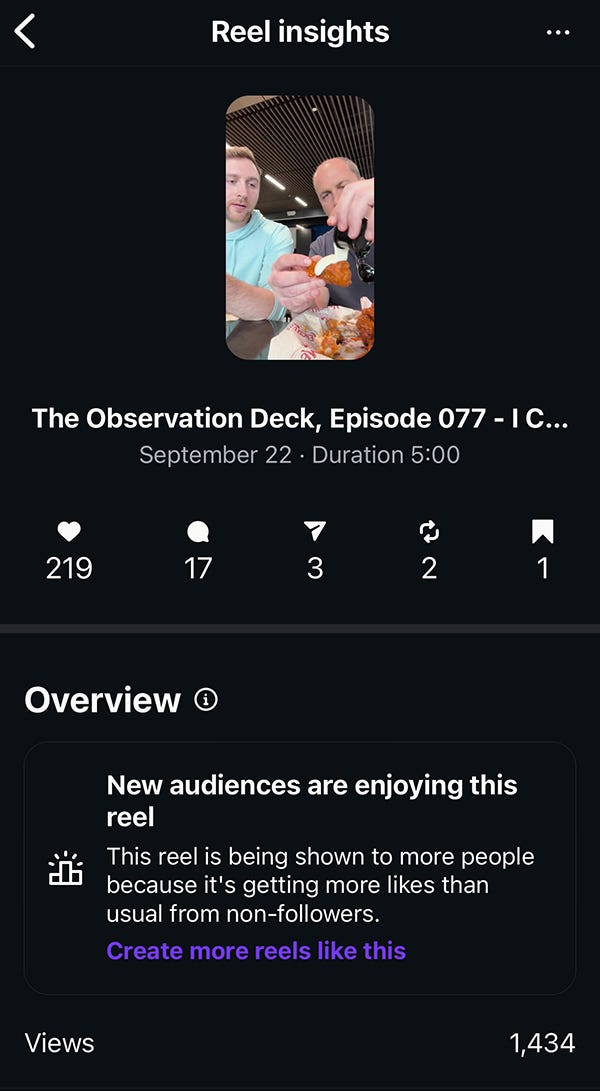 I’m currently in Season 4 of I Can Do Another 12: The Global Chicken Wing Show, and I’ve gotten even more aggressive in challenging businesses to engage—almost teeing it up for them through tagging, commenting, and, on Instagram, sending invites to collaborate. That way, our videos automatically show up on their accounts too. Most recently, Akron-Canton Airport accepted our invite, and the post generated over 200 likes, 17 comments, and a handful of shares. Overall views are approaching 1,500.